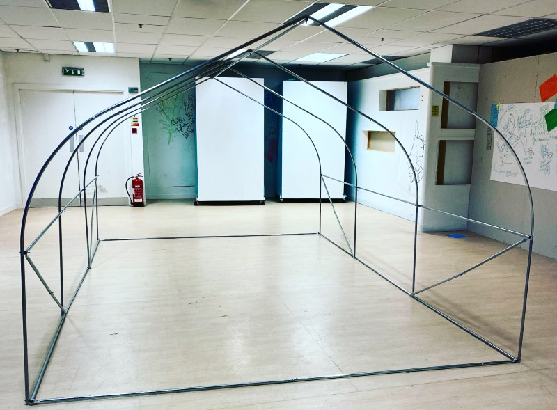 To build the installation the artist has used a Polytunnel frame, textiles and wishful thinking.
